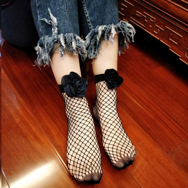 Harajuku Sexy black fishnet short socks women Black Flower Ankle High Thin Sexy Womens Socks Meias Calcetines #417 BL